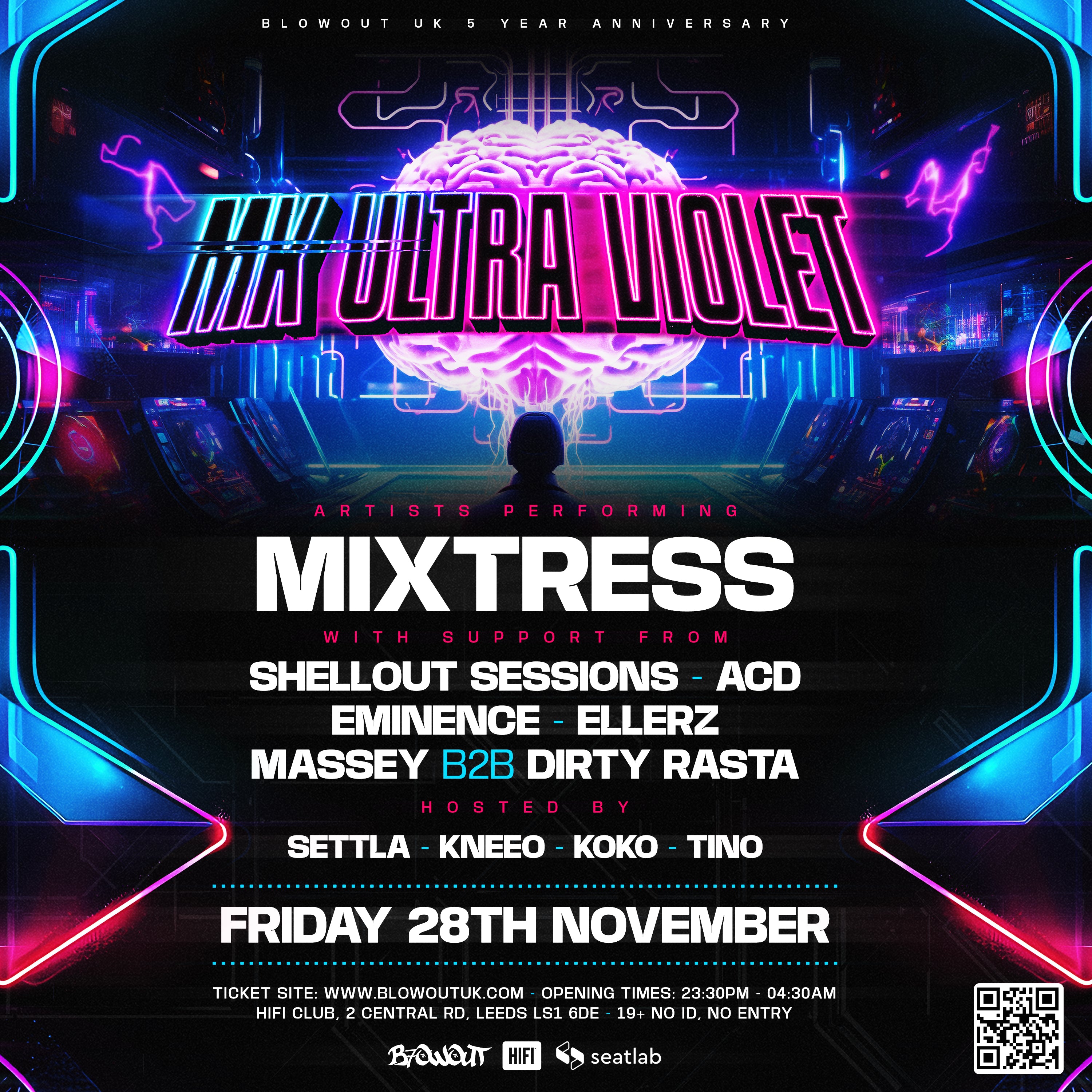 Blowout UK is turning up the heat for the second episode of the 5-year anniversary saga with MK Ultra Violet 🔥 A full throttle DnB & UKG UV rave at the legendary Hifi Club Leeds on Friday 28th November 11:30pm – 4:30am.